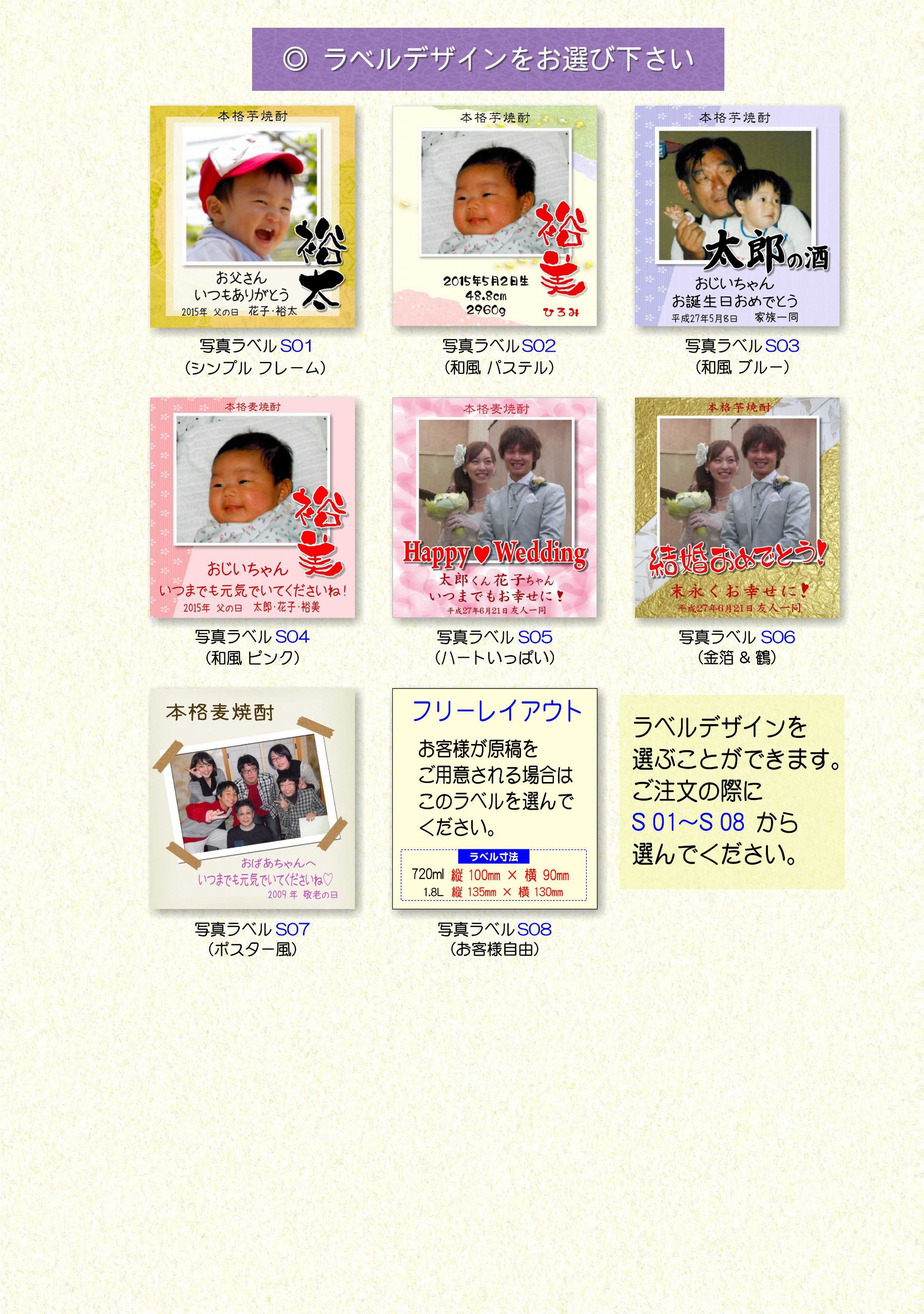 オリジナル写真ラベル用に、基本デザインを8パターンご用意しています。(S01~S08)