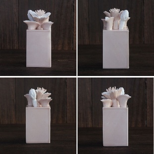白磁とは思えない彫刻のような細かい造形は従来の焼き物のイメージにとらわれない作風を確立し表現しています。